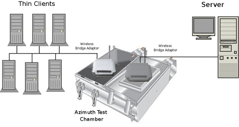 The Azimuth is a test platform for system-level testing of 802.11 wireless networks. It holds two wireless devices (in our case, the devices making up our bridge) in separate chambers and provides an artificial medium between them, creating complete isolation from the external RF environment. The Azimuth can attenuate the medium between the wireless devices and can convert the attenuation in decibels to an approximate distance between them. This gives us the repeatability, which is a rare thing in wireless LAN evaluation. A graphic representation of our testbed is shown in Figure 2.