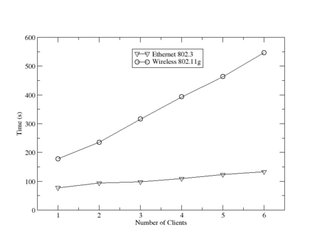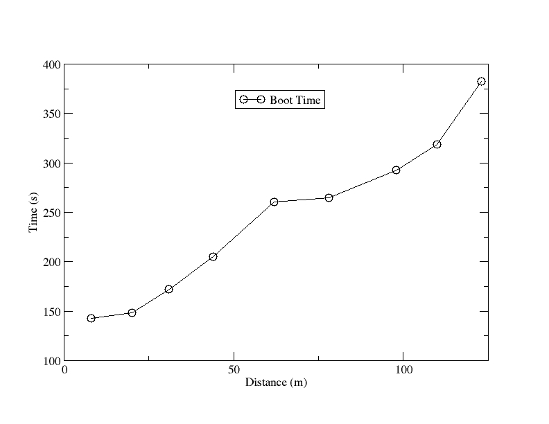 We tested the thin-client network extensively in three different scenarios: first, when multiple clients are booting simultaneously over the network; second, booting a single thin client over the network at varying distances, which are simulated by altering the attenuation introduced by the chamber; and third, booting a single client when there is heavy background network traffic between the server and the other clients on the network.