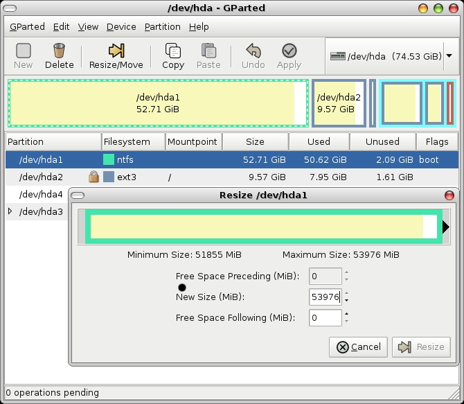 The first decision to make was which Linux distribution to install. In the end, I chose Ubuntu. I had heard some pretty good things about it, particularly with respect to its package manager and hardware recognition. Setting up the dual-boot system was pretty easy. The computer came with Windows pre-installed, so all I needed to do was shrink the Windows partition and create a Linux partition structure. I used GParted, the GNOME partition editor, which is very easy to use (Figure 1) and can non-destructively resize partitions formatted with any common filesystem, including NTFS, the proprietary filesystem used by Windows XP and Vista. You shouldn't expect any data loss, but nevertheless, it's a good idea to back up the partition before resizing it. You can burn a bootable GParted CD or run it from the Ubuntu Live CD/DVD.