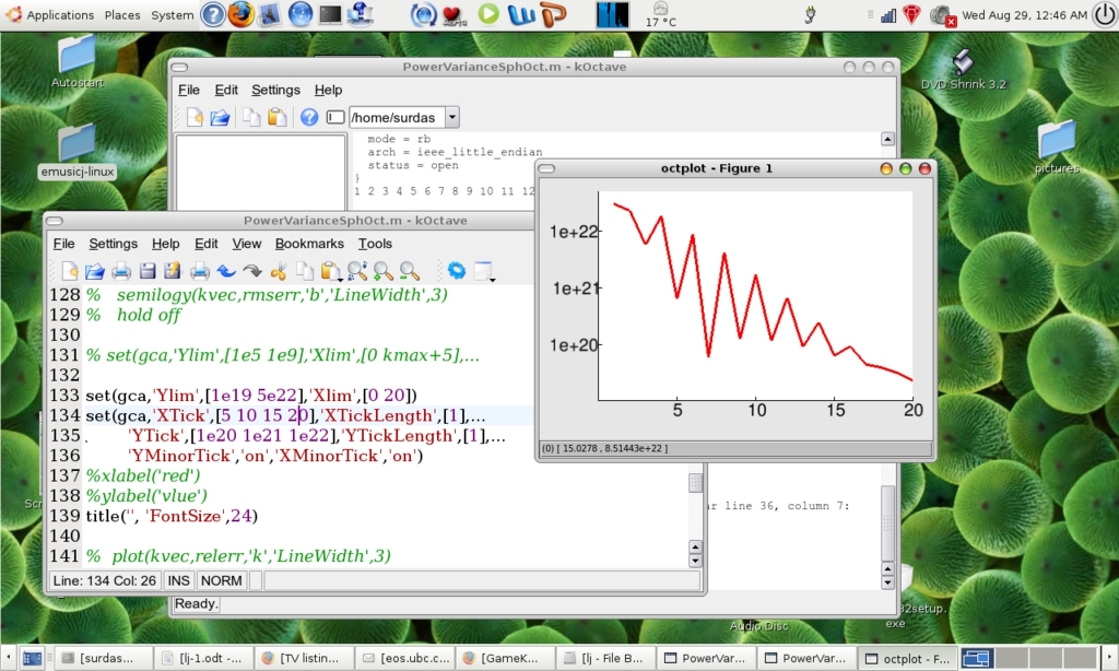 The main specialized proprietary applications that I use are the MathWorks' MATLAB (an excellent programming environment that can be installed in Linux) and CorelDRAW (graphical software). The simplest open-source alternative is GNU's Octave, which is in most ways a clone of MATLAB. It is quite easy to use Octave as a drop-in MATLAB replacement, as it uses the same language as MATLAB. With some exceptions, most computational scripts written for MATLAB will run correctly in Octave. The one major exception is graphics. Although MATLAB has an integrated graphical user interface (GUI) and graphics handler, Octave interfaces with several different GUIs and plotting applications. Gnuplot is the default plotter, but it isn't ideal for producing publication-quality graphics. I use the Koctave GUI with Octplot or Grace for plotting (Figure 3); both are pretty good, although only Grace allows you to make changes to a graph once it has been created. MATLAB's main advantage is that it is significantly faster and easier to use. On the other hand, you can install Octave on as many machines as you like, so it may be convenient to use both if you have a MATLAB license.
