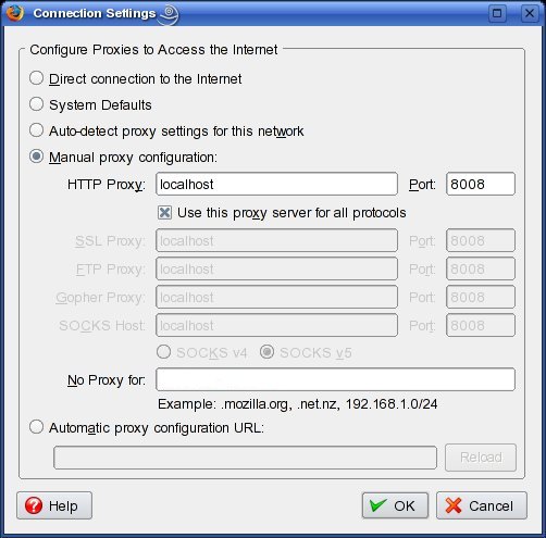 Figure 1 shows the proxy configuration screen in Firefox. Access this screen from the Edit menu: Edit→Preferences→Advanced→Network→Connection→Settings. This dialog is very similar in other browsers. If your browser's proxy configuration dialog has a proxy-exceptions field, like Firefox's “No Proxy for:” box shown in Figure 1, make sure this field is blank or that it at least does not contain the values 127.0.0.1 or localhost.