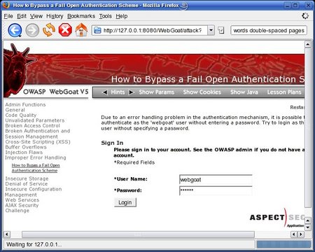 This doesn't mean WebGoat is poorly organized; it just means that the lessons are nonsequential, being instead grouped by type (Code Quality, Invalidated Parameters, Buffer Overflows and so forth). In summary, you will have a much more positive WebGoat experience if you first read the “OWASP Top 10 2007”, attempt whichever lessons strike your fancy, paying attention to each lesson's Lesson Plan button, and click the Hints button as necessary. And, if all else fails, there's always Google!