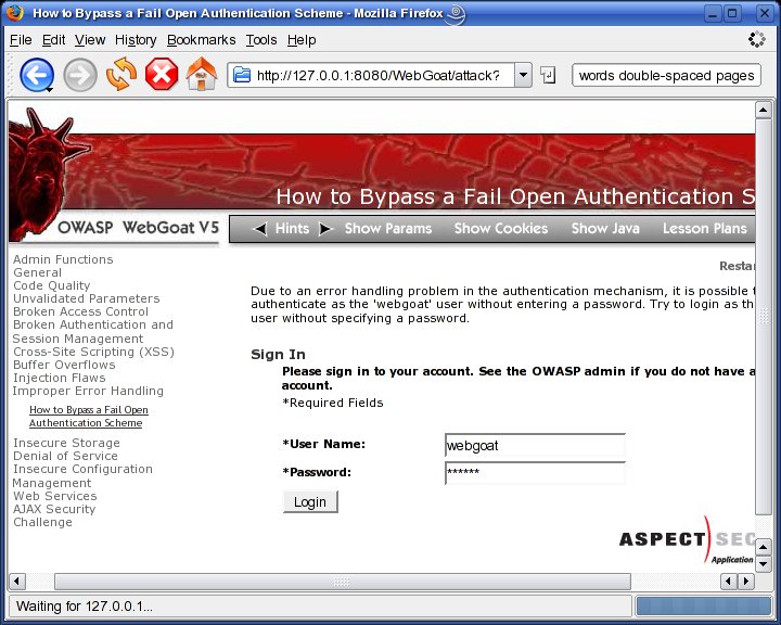 WebGoat covers this under the “Improper Error Handling” section, in the “How to Bypass a Fail Open Authentication Scheme” lesson. To start this lesson, click the “Improper Error Handling” link on the left-hand frame of the WebGoat interface, and then click the “How to Bypass a Fail Open Authentication Scheme” link that appears below it.