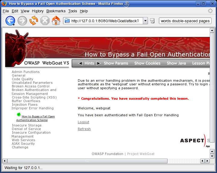 One of my favorite WebGoat lessons is the one on fail-open authentication mechanisms. If it's possible to make a user-authentication transaction fail in a way that results in successful authentication, that authentication mechanism is said to “fail open”. Needless to say, this is not the way a secure access mechanism behaves! But, it's a common Web coding mistake.