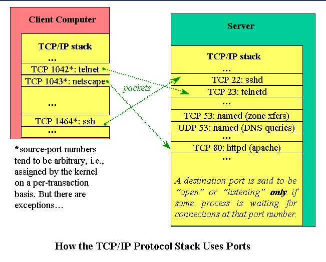 The last bit of TCP/UDP port trivia you may be interested to know is the difference between source ports and destination ports. Each TCP or UDP packet has both a destination port (i.e., the port number to which that packet is being sent) and a source port (i.e., the port number from which that packet's originating process sent the packet, and to which the remote service/dæmon's replies should be sent).