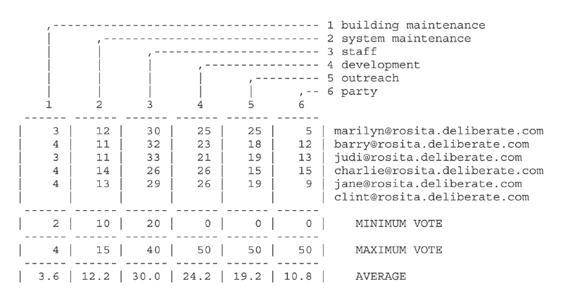 eVote poll group public visible 100 1. building maintenance [2,4] 2. system maintenance [10,15] 3. staff [20,40] 4. development [0,50] 5. outreach [0,50] 6. party [0,50] Message: Please help spend our budget. We'll distribute our funds according to the average of all our votes.